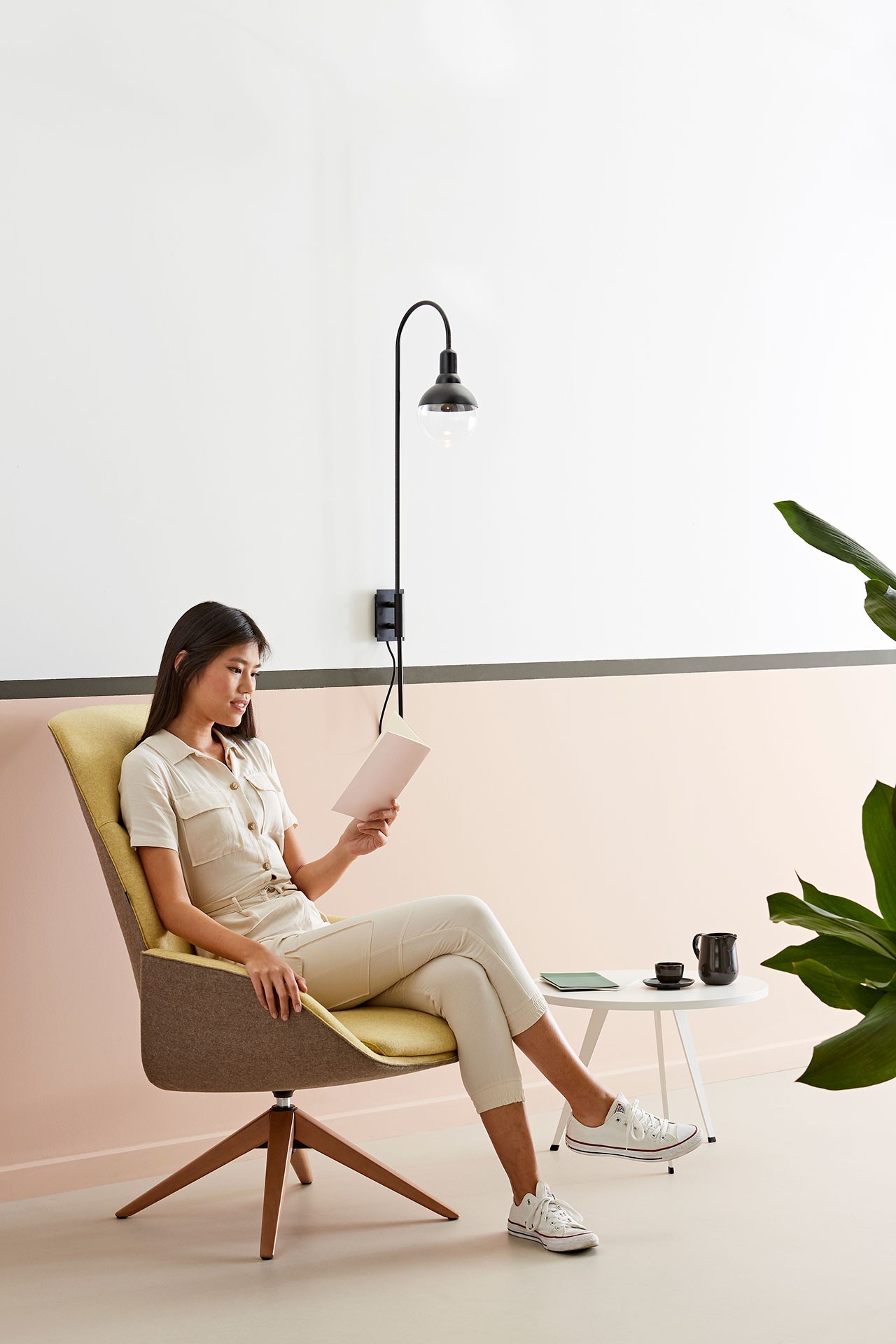 The high back version of the Noom Arm Chair offers additional support for the upper back and neck. This makes it an ideal choice for people who spend a lot of time sitting in front of a desk or computer. The chair’s pyramidal wooden legs add a touch of warmth and natural beauty to any space. This makes it perfect for use in a wide range of settings, from meeting rooms and waiting areas.