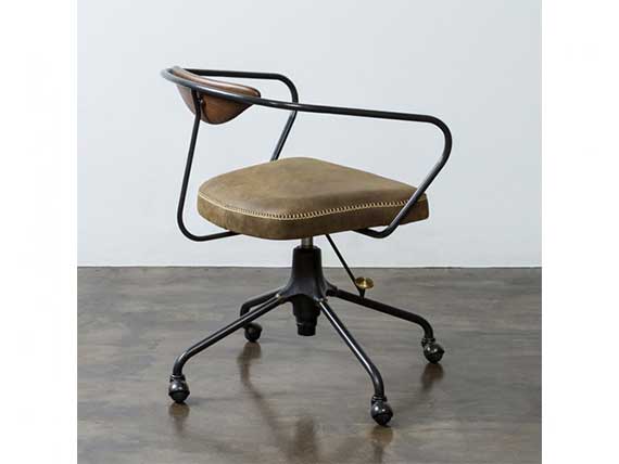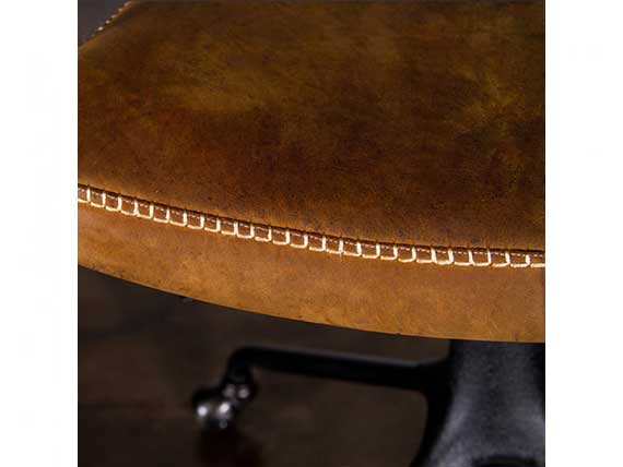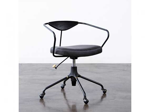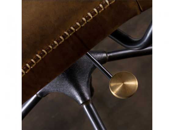 Designed with a contemporary iteration of industrial task stools in mind, the Akron Desk Chair from District 8 features beautiful brass detailing and hand stitched leather seats, supported by beautifully sculpted, elegant cast iron legs. This model features additional support, with a solid oak backrest available in three different finishes, and cast iron armrests.