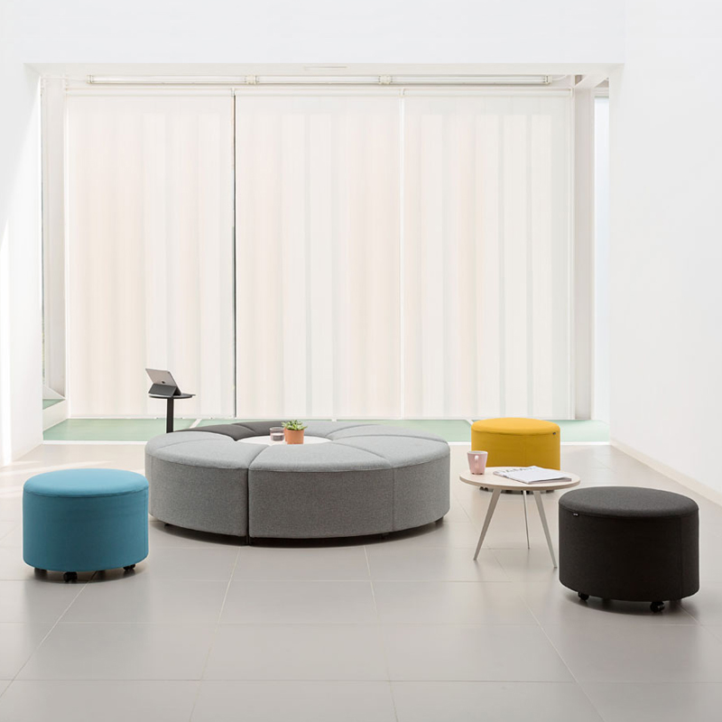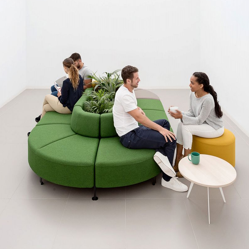 Bend soft seating allows you to create comfortable and informal meeting points that foster communication among employees. Its simple design and appearance invites you to take a seat. Bend is made up of 4 different modules that can be connected to one another, including forming a closed circle. The possibilities are endless, the only limit is your imagination. The Bend soft seating for offices has different modules and structures. The wooden finish on the legs adds an extra warmth and homely feel to the office. Bend comes with different accessories including round modules and side tables of different heights. These elements can ‘orbit’ around the Bend layout, adding to its dynamism.