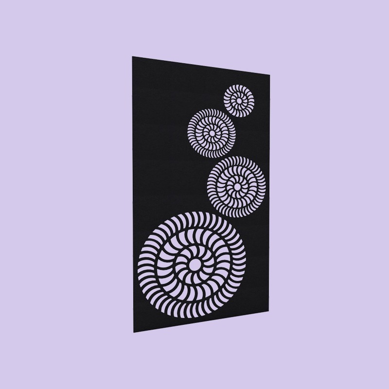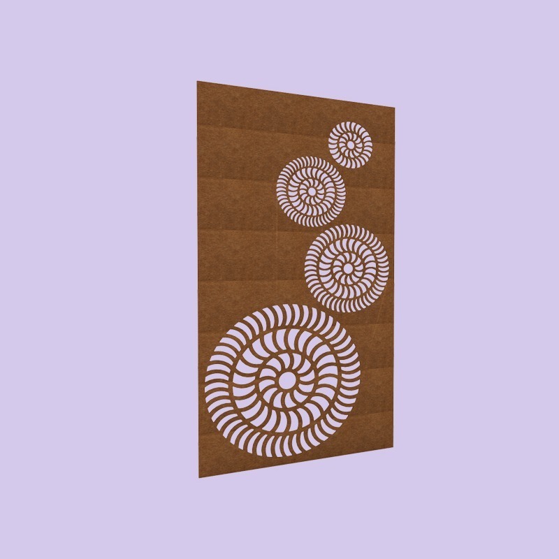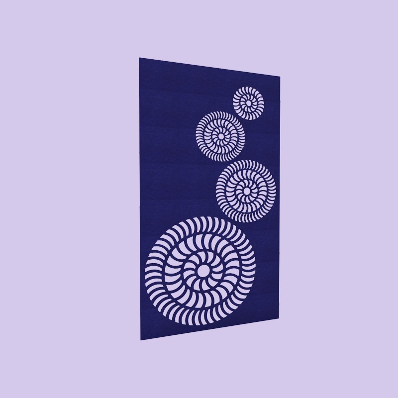 Wheel/spiral-detailed cutouts, crafted with the aid of computational design, gracefully adorn this sound-absorbing screen. Use it to partition smaller areas within larger spaces, while enhancing both visual and acoustic privacy.