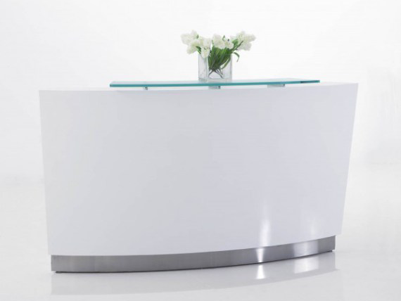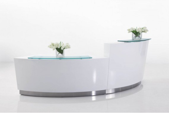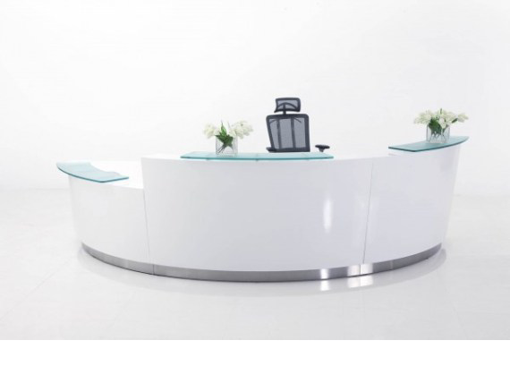 Evo has the wow factor. Beautiful circular design in gloss white with glass hobs, white desktop and stainless steel kick plate.