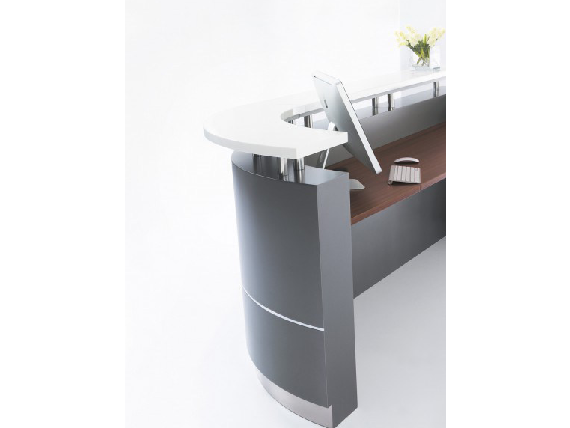 Contemporary and classy with pleasing lines. Counter body in metallic grey with feature Aluminium strips and contrasting jade white stone hob. Matt teak desktop and stainless steel kick plate. With both left and right curved return