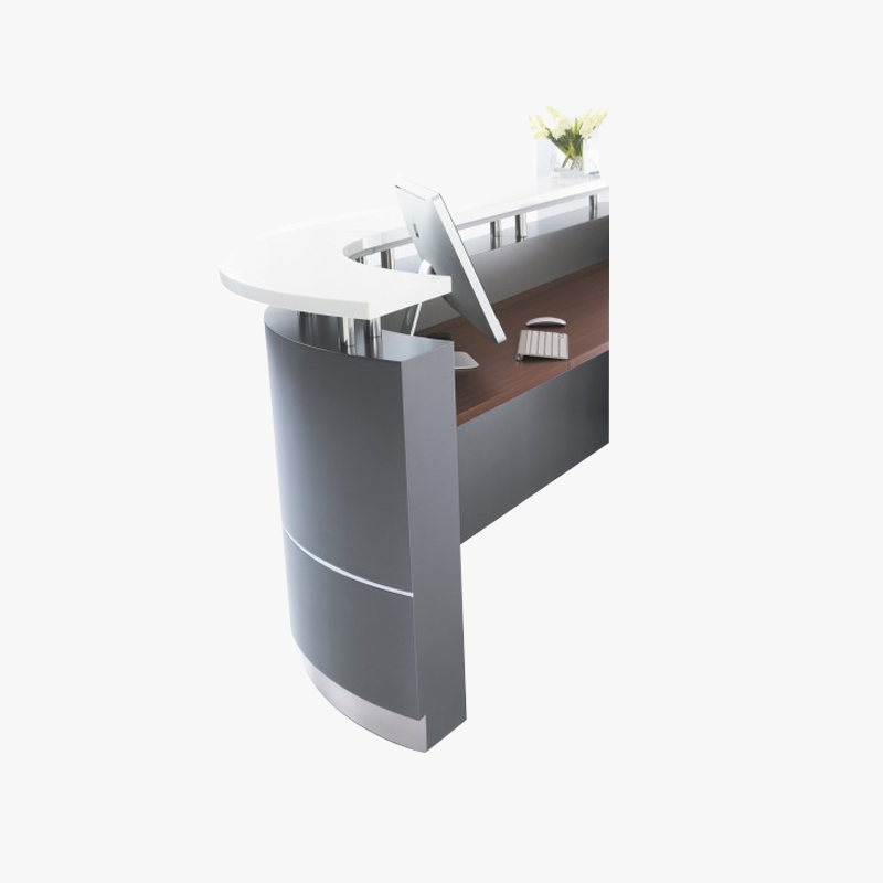 Contemporary and classy with pleasing lines. Counter body in metallic grey with feature Aluminium strips and contrasting jade white stone hob. Matt teak/white desk top and stainless steel kick plate, with left curved return.