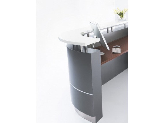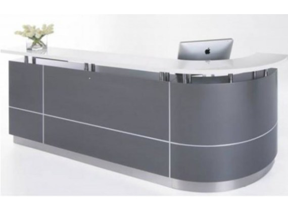 Contemporary and classy with pleasing lines. Counter body in metallic grey with feature Aluminium strips and contrasting jade white stone hob. Matt teak/white desk top and stainless steel kick plate, with left curved return.