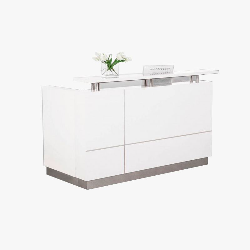 Clean modern lines with style and functionality. Quality materials and fittings. Counter body in gloss white with feature aluminium strips. Matt white desk top, jade white stone hob and stainless steel kick plate.