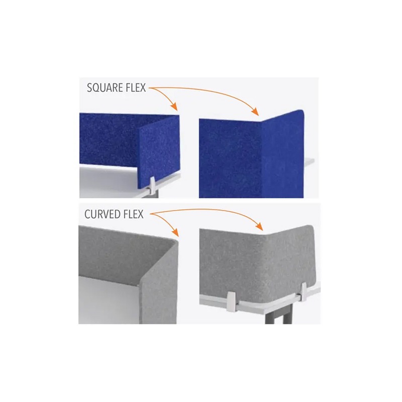 Hush Flex Screens are multi-directional acoustic desk dividers that sit above the height of the worktop.