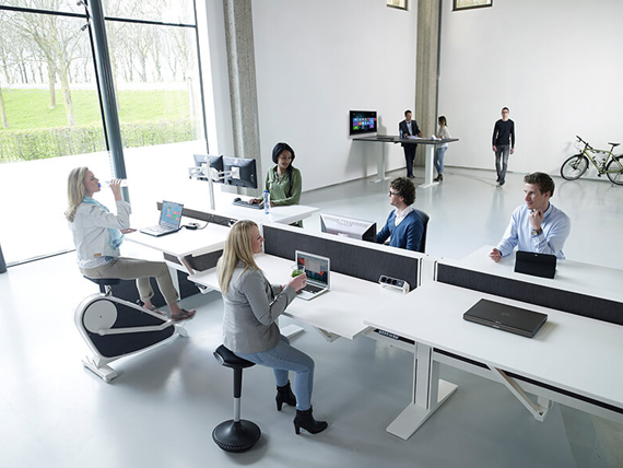 A MAX workstation is easy to transform from a comfortable sitting desk into an active standing workstation. The rapid adjustability of the worktop and simple operation make switching between sitting and standing easy and attractive. With MAX, the number of sitting hours per day by office staff can be significantly reduced.