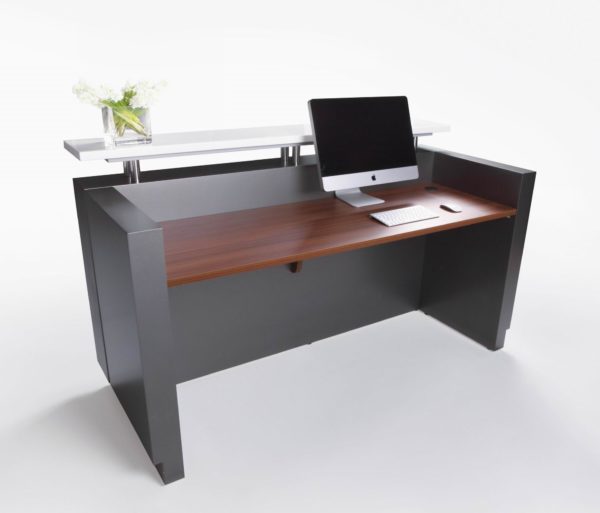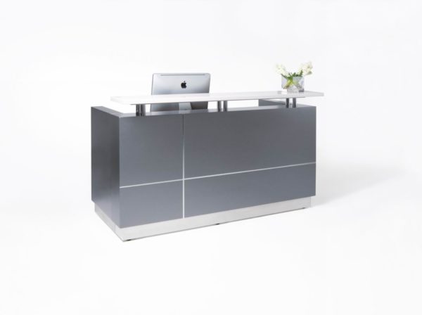 Clean modern lines with style and functionality. Quality materials and fittings. Counter body in metallic grey with feature aluminium strips. Matt teak or white desk top, jade white stone hob and stainless steel kick plate.