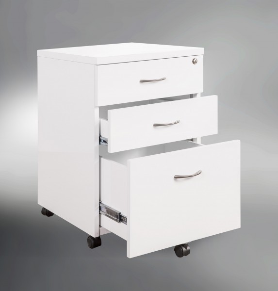 Mobile Pedestal, 2 pencil drawers and 1 filing drawer, with multi lock. Finished in high quality 2 pack paint in super gloss white.