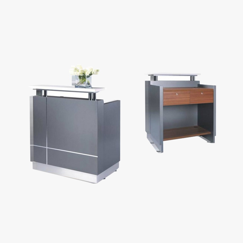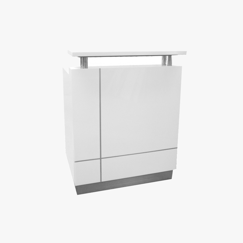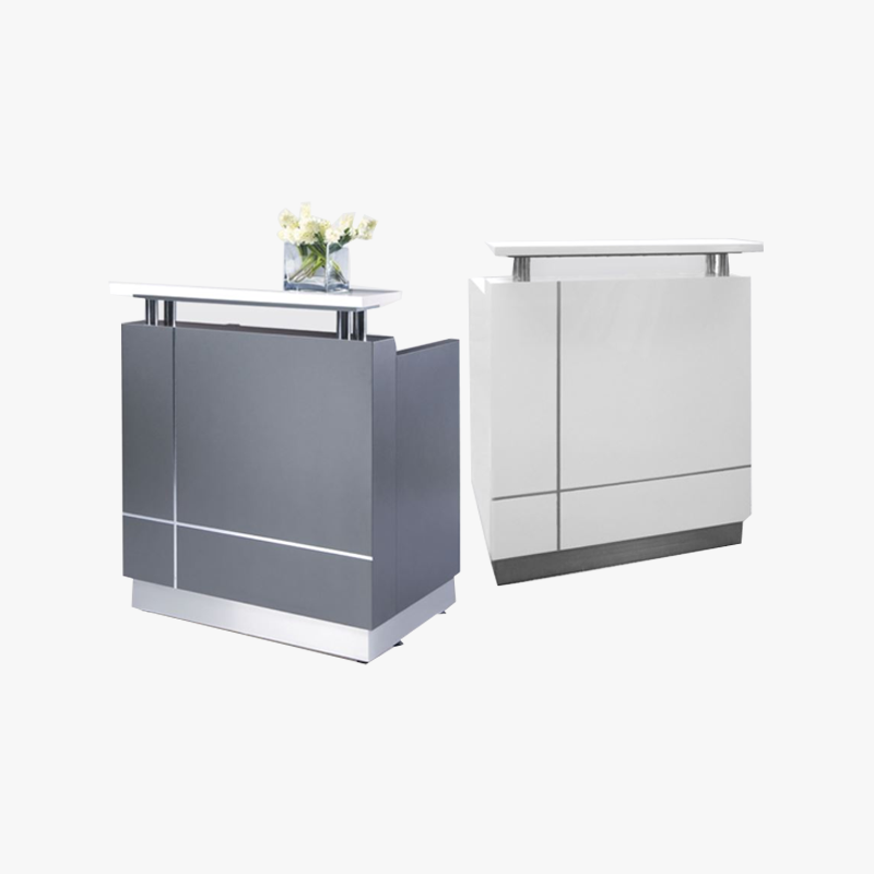 Counter body available in 2 colours; metallic grey or high gloss white with feature aluminium strips.