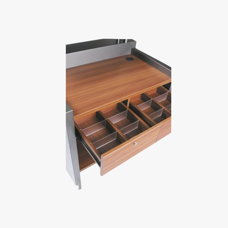 Elegant and versatile. Ideal for retailers. Teak desktop with two lockable drawers.