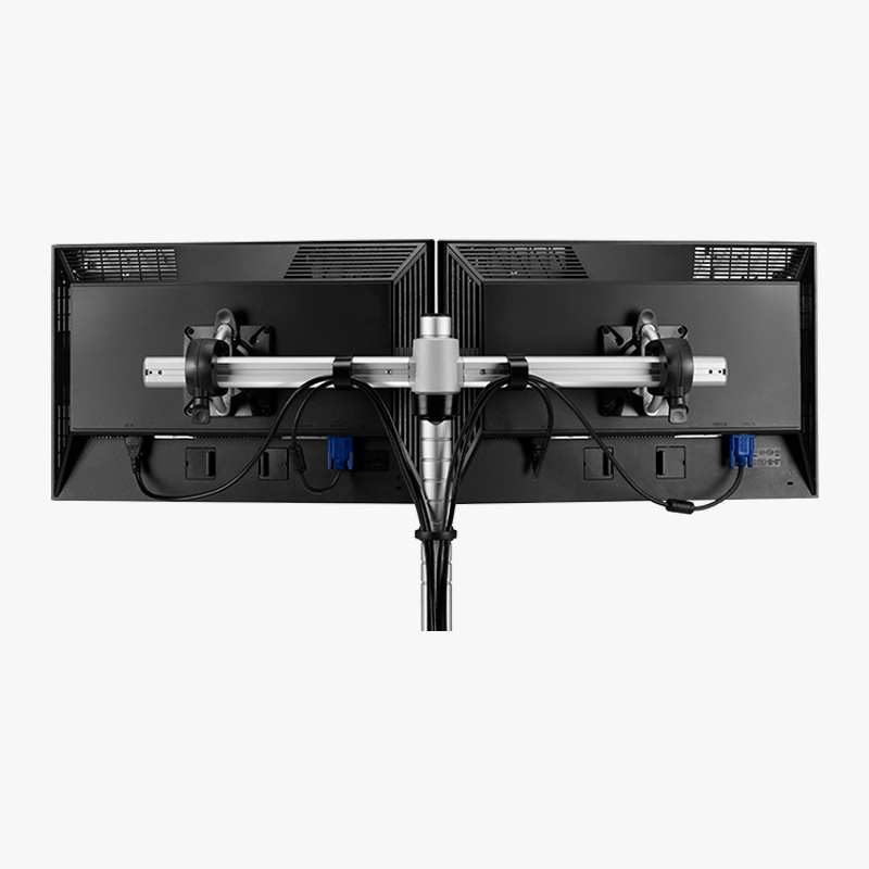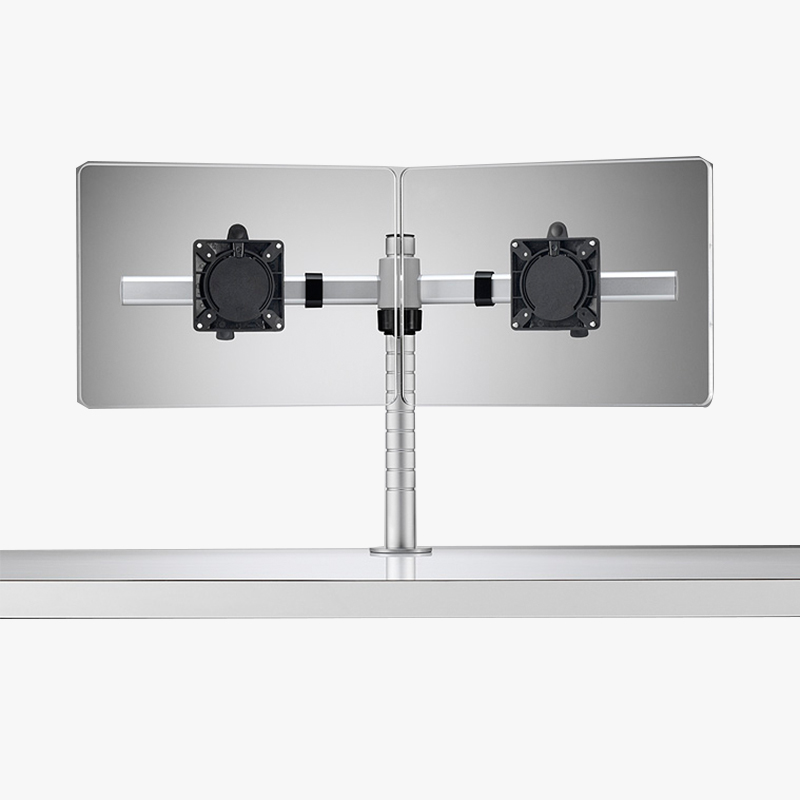 The Wishbone Dual Bar is our entry level dual monitor stand solution that is ideal for holding two screens of equal size and dependency in position.By removing and inverting the screen holders you can create a cockpit screen set-up with minimum effort and disruption.Being able to remove the screens quickly and efficiently is desirable although there are occasions when the screens need to be secured. This can be achieved with the security screw feature that locks the screens in position.Depending on task requirements the screens can be positioned in either portrait or landscape configuration, by using the fine height adjustment feature the screens can always be perfectly aligned.Should you want to convert your set-up to quad screen usage it is easy to do so, simply add another Wishbone Dual Bar and post to your existing kit of parts, the posts connect securely together to create the additional height required for the second bar.
